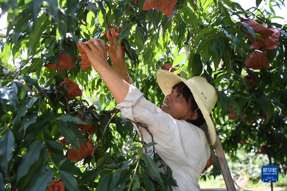8月8日,桃農在炎陵縣下村鄉坳頭村采摘黃桃。
