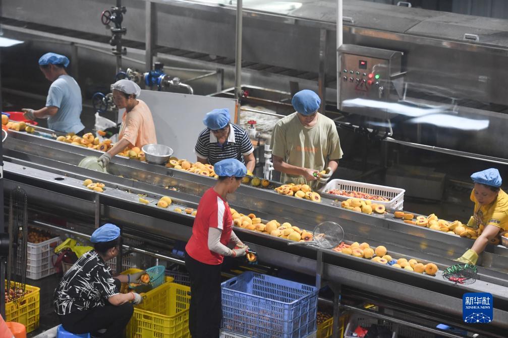 8月8日,工人在炎陵縣湖南娜妹子食品有限公司加工黃桃罐頭。