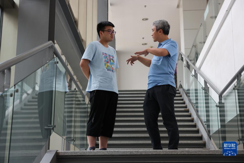 7月21日,在位于安徽合肥的中國科學技術大學,彭承志(右)在第十四屆物理與化學夏令營微尺度分營上作報告后與參加夏令營的學生交談。