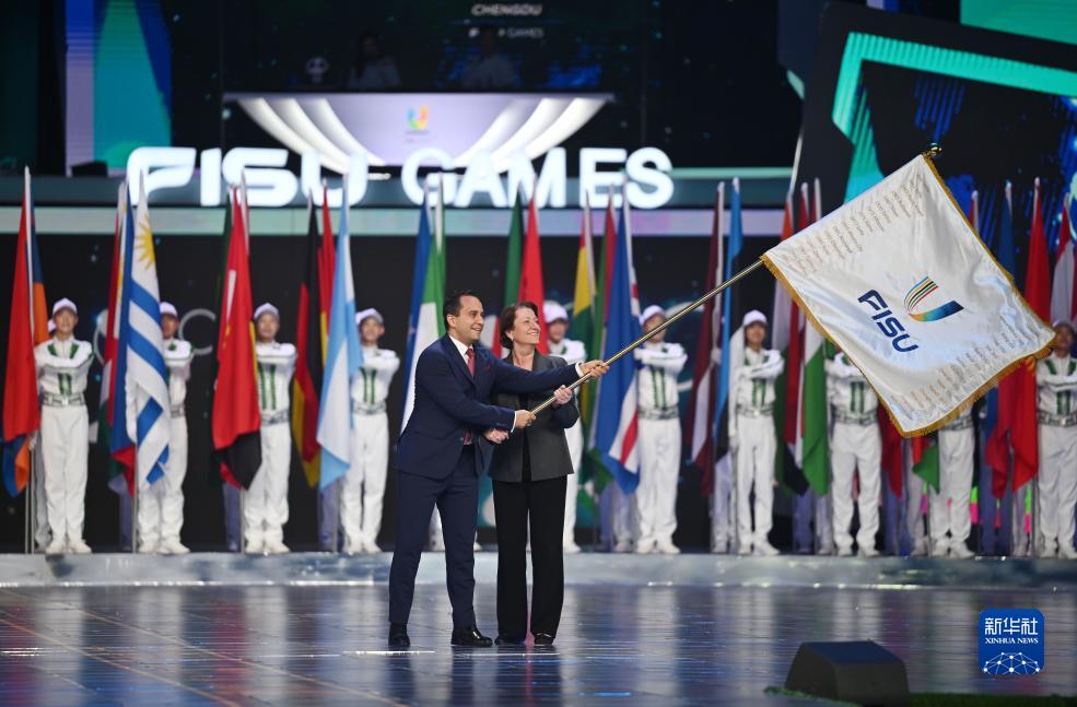 8月8日,下一屆大運會主辦城市代表、德國聯邦內政和國土部議會國務秘書馬哈茂德·厄茲德米爾(左)和國際大體聯首席執委維麗娜·伯克在會旗交接儀式上。