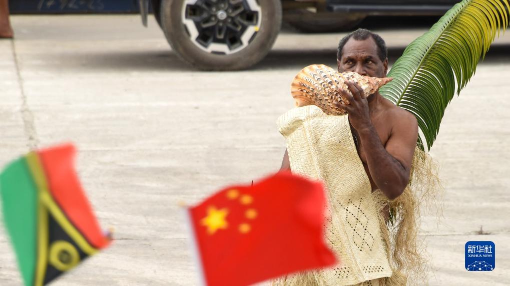8月8日,中國海軍“和平方舟”號醫院船抵達瓦努阿圖共和國維拉港,一名身著傳統服飾的當地男子吹響海螺歡迎中國海軍官兵。