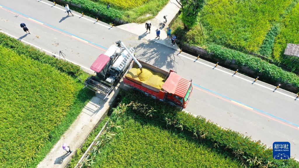 8月8日,在重慶市梁平區安勝鎮,收割機將收獲的稻谷裝上卡車(無人機照片)。
