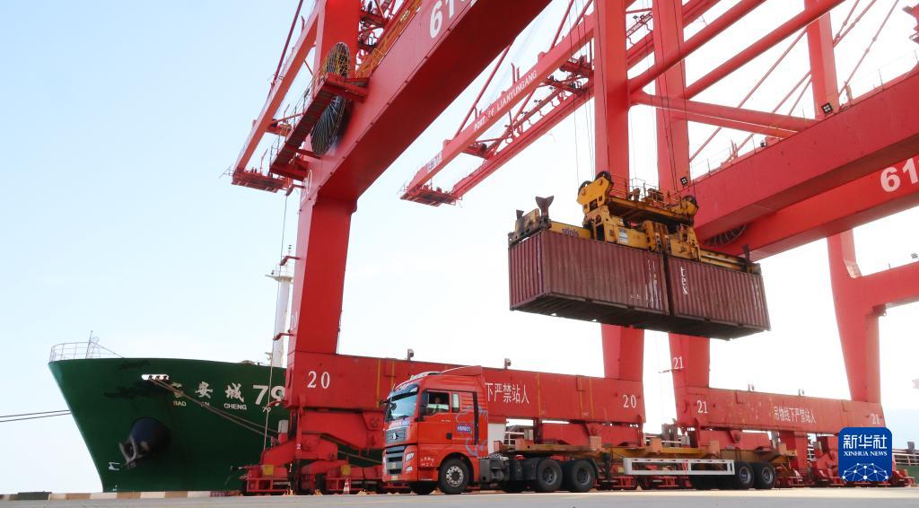 8月8日,在江蘇連云港港,貨輪在進行裝卸作業。