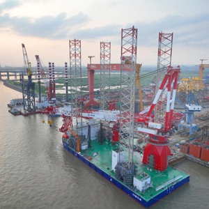 該風電安裝平臺長133.8米,型寬50米,型深11米,總重約28000噸,艉部右舷設2500噸繞樁式全回轉起重機,適用于砂性土、粘性土或類似地質作業,主要用于15兆瓦及以上機組設備安裝,可同時運載2套15兆瓦風機機組設備,最大作業水深70米。新華社發(許叢軍 攝)