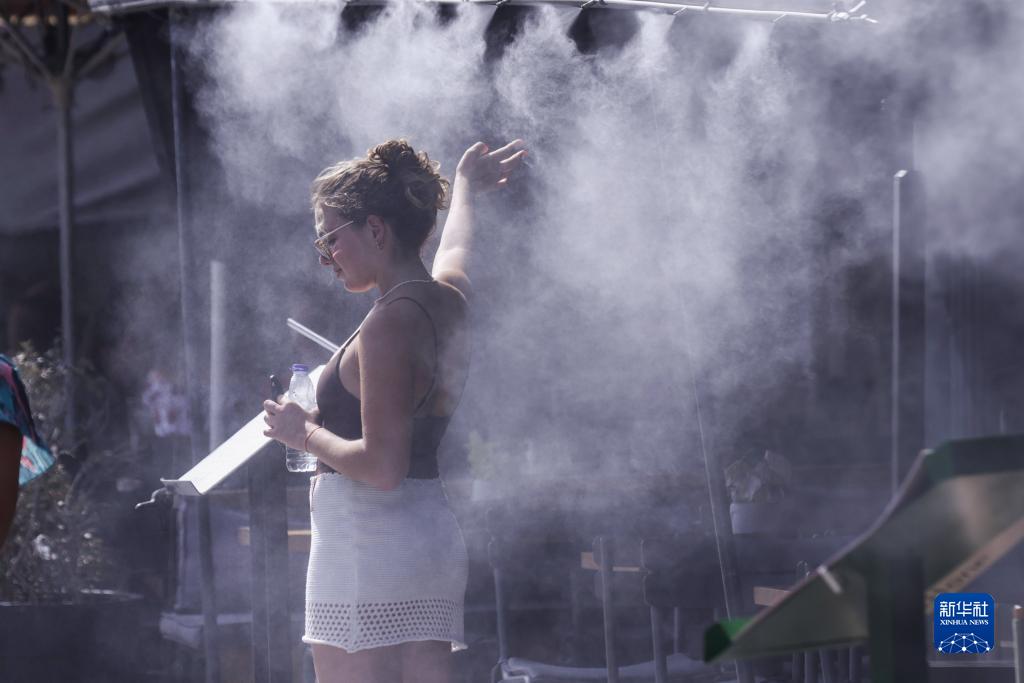 7月23日,在希臘雅典一家咖啡館外,一名女子在噴霧風扇下乘涼。