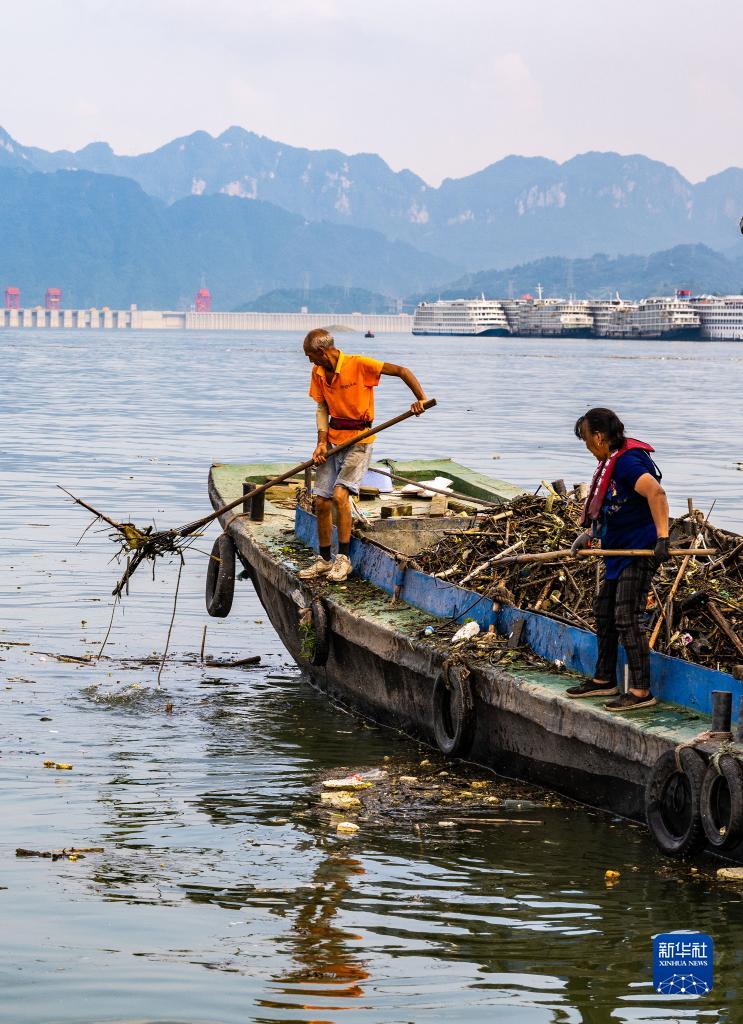 長江進入主汛期以來,秸桿、樹枝、塑料等漂浮物隨波逐流,聚集到三峽庫區的江面上。三峽大壩上游的湖北省宜昌市秭歸縣環保部門組織清漂工人全力清漂,以減輕漂浮物對三峽樞紐運行的影響,確保三峽水庫水質不受污染,保障船舶航行安全。
