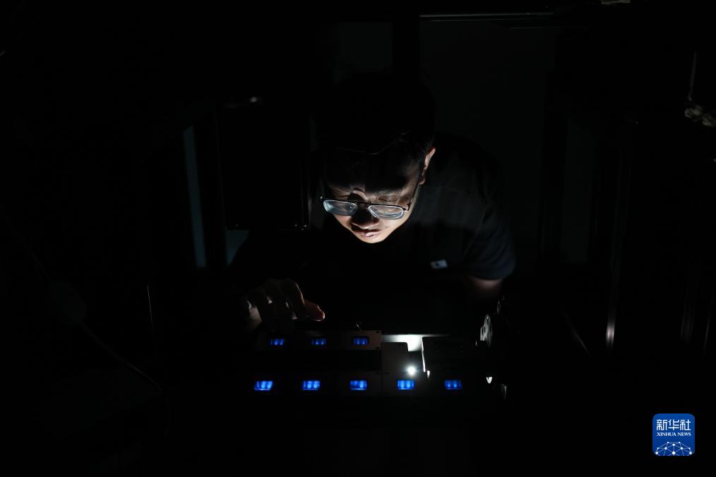 8月9日,在臺州市黃巖區浙江光昊光電科技有限公司,工作人員在測量間檢測OLED有機發光半導體器件。