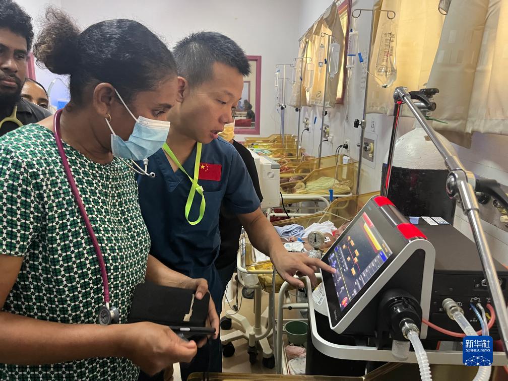 5月1日,在巴布亞新幾內亞莫爾茲比港總醫院新生兒科,第12批援巴新中國醫療隊副隊長劉振球為當地醫護人員開展呼吸機操作培訓。