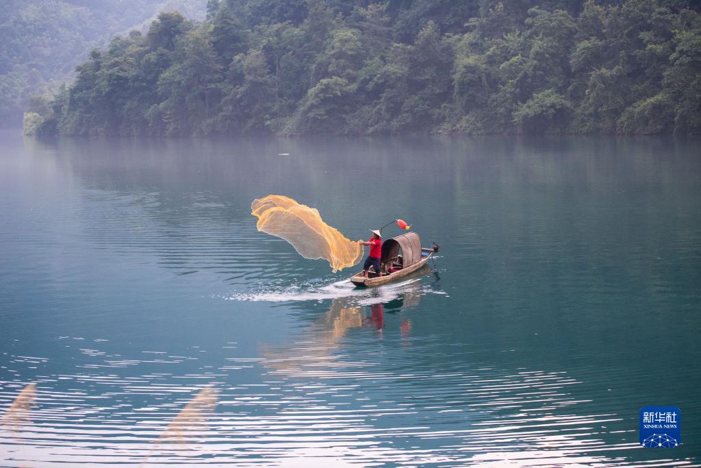 8月9日,在資興市東江湖風景區,漁夫在進行撒網表演。