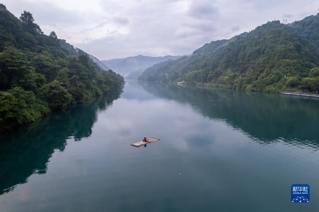 8月9日,一只小船漂浮在資興市東江湖風景區小東江上(無人機照片)。