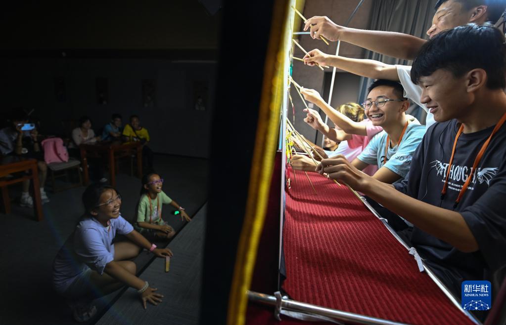 暑期研學的學生在中國秦腔藝術博物館里體驗皮影戲演出(8月8日攝)。