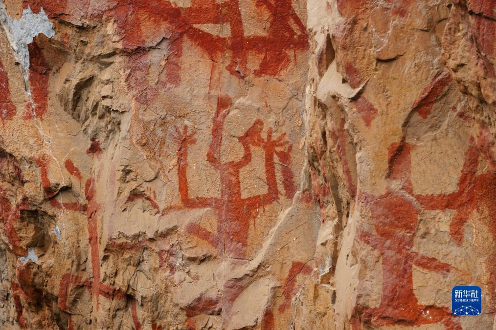 這是巖畫局部,一個戴著漂亮羽飾的人像(8月8日攝)。