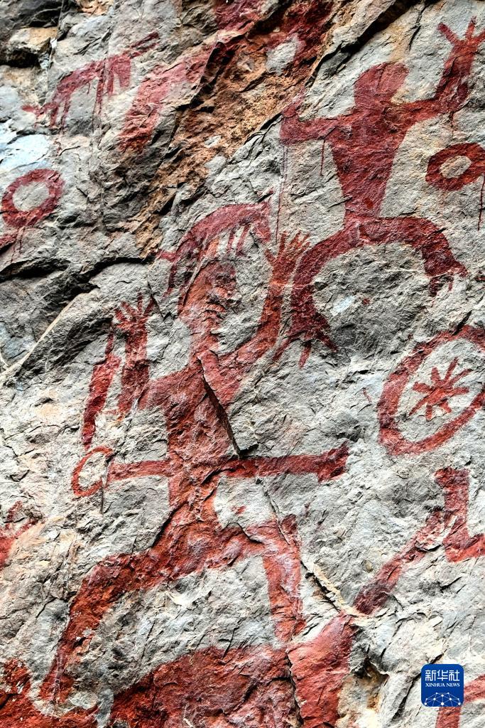 這是廣西崇左市寧明縣的花山巖畫,畫面表現的是某種儀式(8月8日攝)。