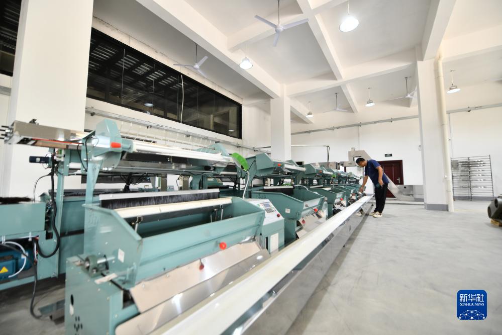 在融水苗族自治縣融水鎮新安村水融香茶園茶葉種植基地,工作人員在測試即將投入使用的自動化制茶設備(8月9日攝)。