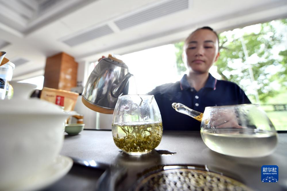 在融水苗族自治縣融水鎮新安村水融香茶園茶葉種植基地,茶藝師在向游客展示茶藝(8月9日攝)。