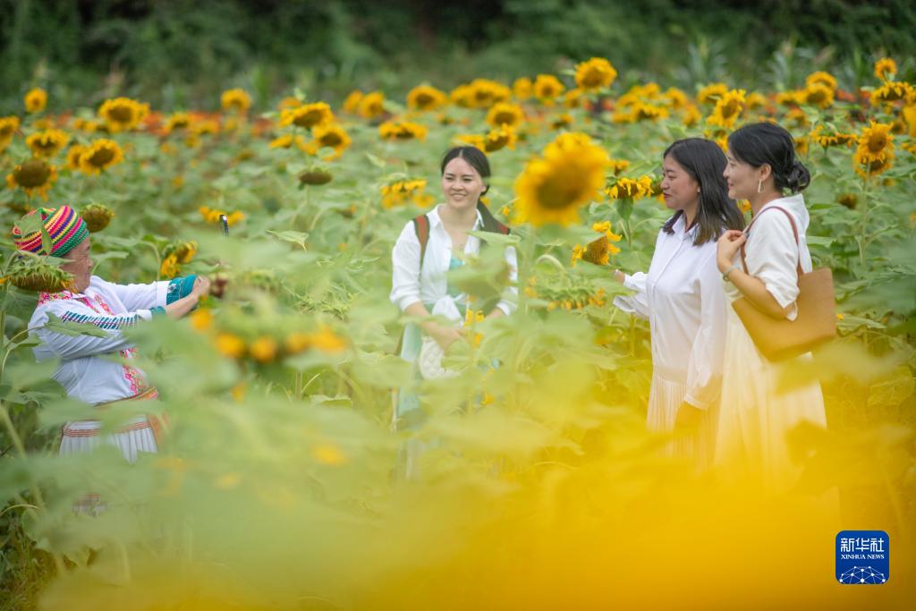 8月9日,游人在云南省文山壯族苗族自治州文山市平壩鎮賞花拍照。