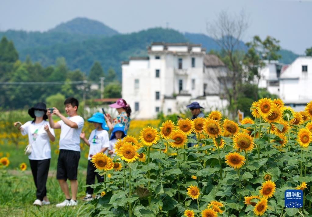 8月9日,游客在安徽省黃山市屯溪區屯光鎮漢沙村欣賞向日葵花海。