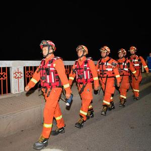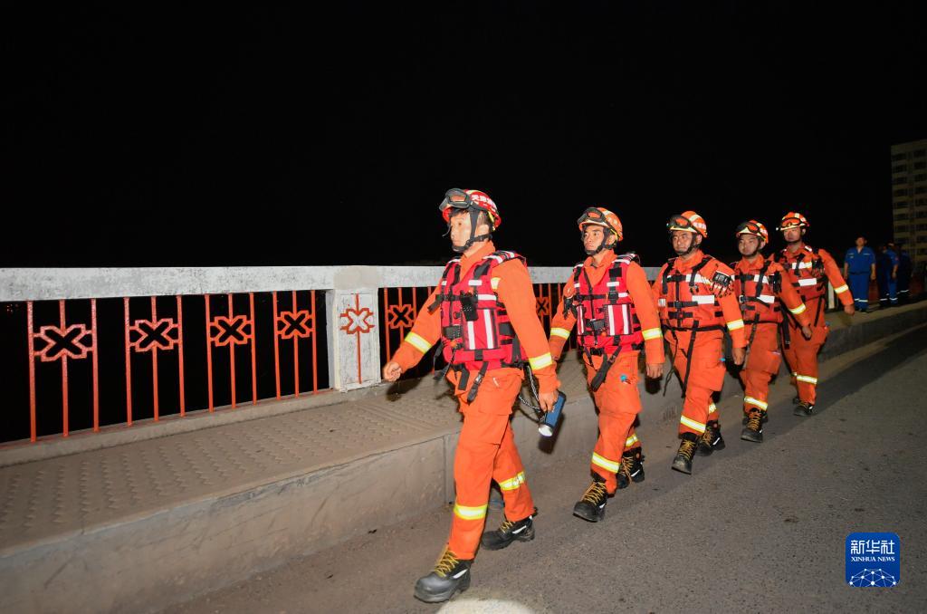 8月9日凌晨,在天津市靜海區臺頭鎮,天津消防救援總隊的消防員巡查經過革命橋。