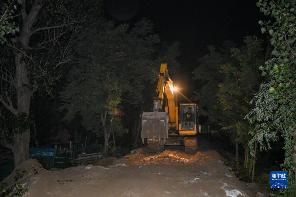 在天津市靜海區大清河臺頭段南堤,大型工程機械夜間作業加固堤壩(8月7日攝)。