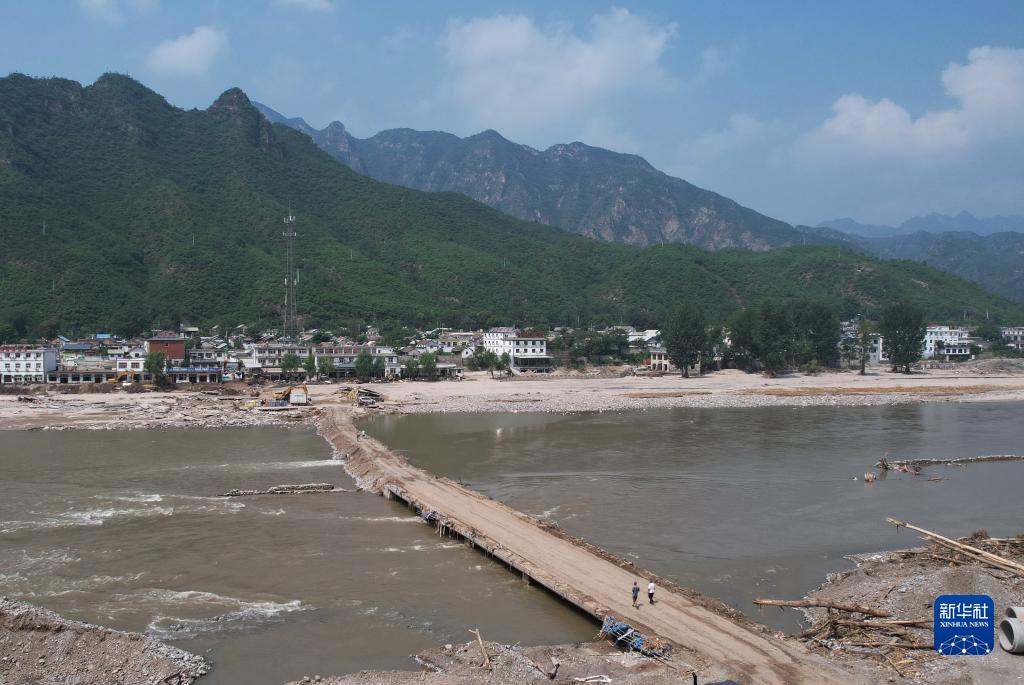 8月9日,淶水縣三坡鎮上莊村的村民從搶修好的進村橋上通過(無人機照片)。