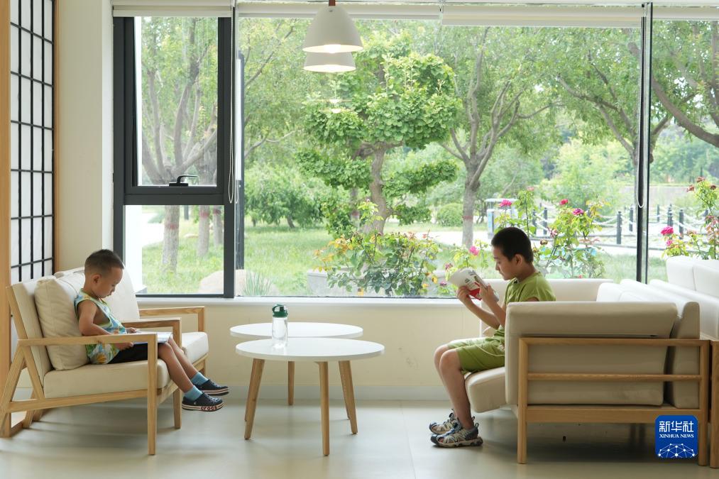 8月9日,小朋友在河北省石家莊市花卉園內一處公園書房閱讀。