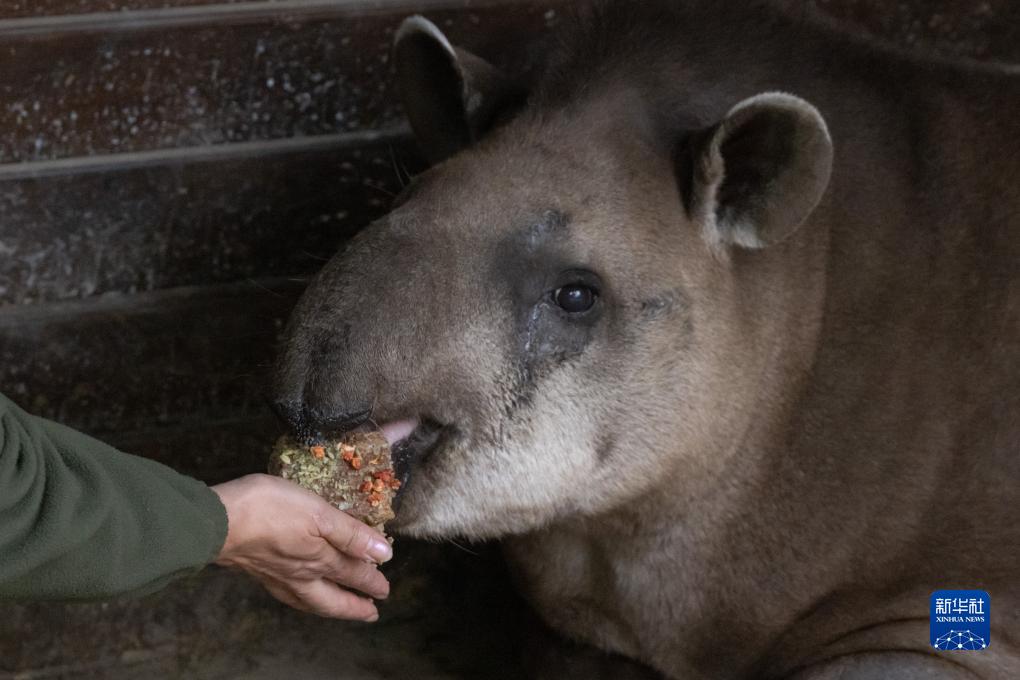 8月9日,在匈牙利布達佩斯動物園,低地貘品嘗特制蛋糕。