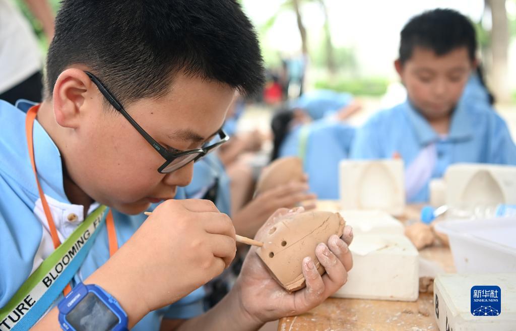 研學學生在西安半坡博物館里制作陶塤(8月9日攝)。