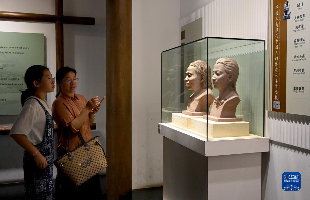 參觀者在西安半坡博物館里了解半坡人的特征(8月9日攝)。