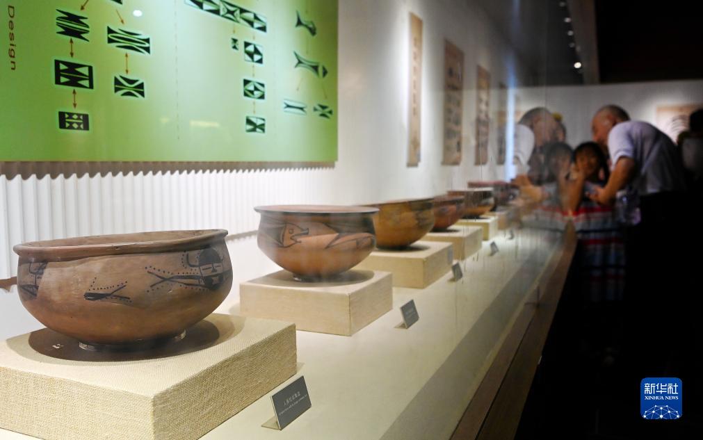 參觀者在西安半坡博物館里觀看彩陶盆(8月9日攝)。