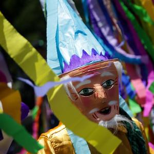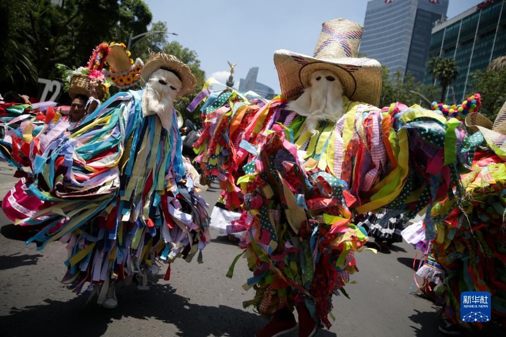 8月9日,在墨西哥首都墨西哥城,演員身著傳統服飾參加世界土著人民國際日慶?;顒?。