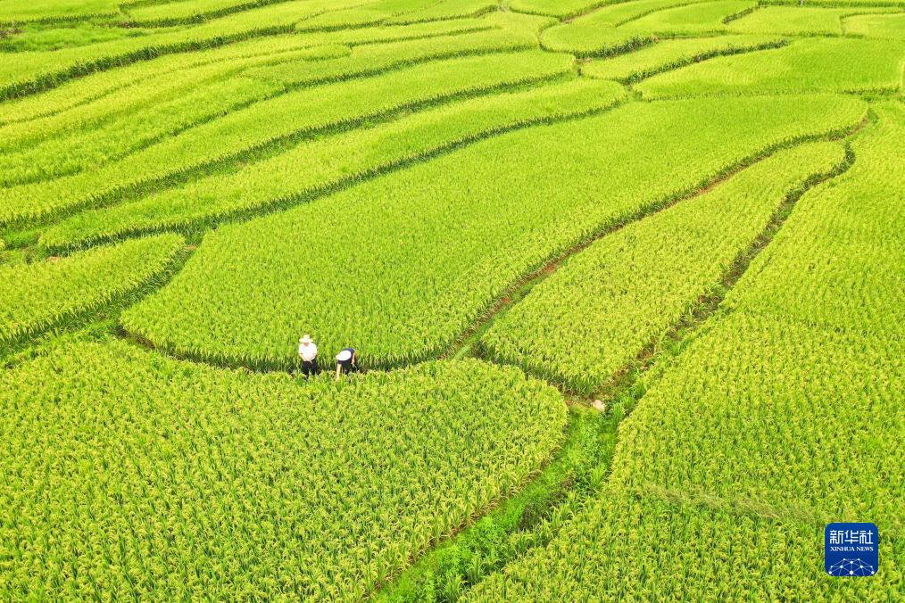 8月9日,在湖南省常寧市塔山瑤族鄉東江村,農民和農技員在查看水稻長勢(無人機照片)。
