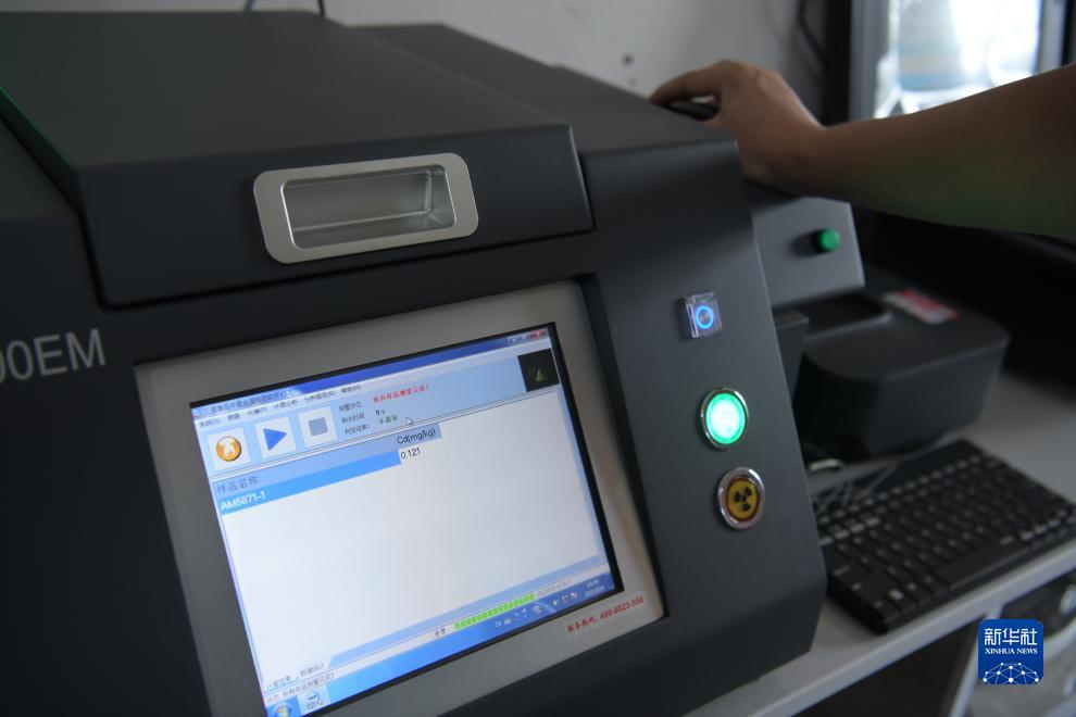 在江西省南昌縣橫崗國家糧食儲備庫,工作人員通過設備檢測抽樣糧食的水分、品質、農藥殘余、重金屬等情況(8月8日攝)。