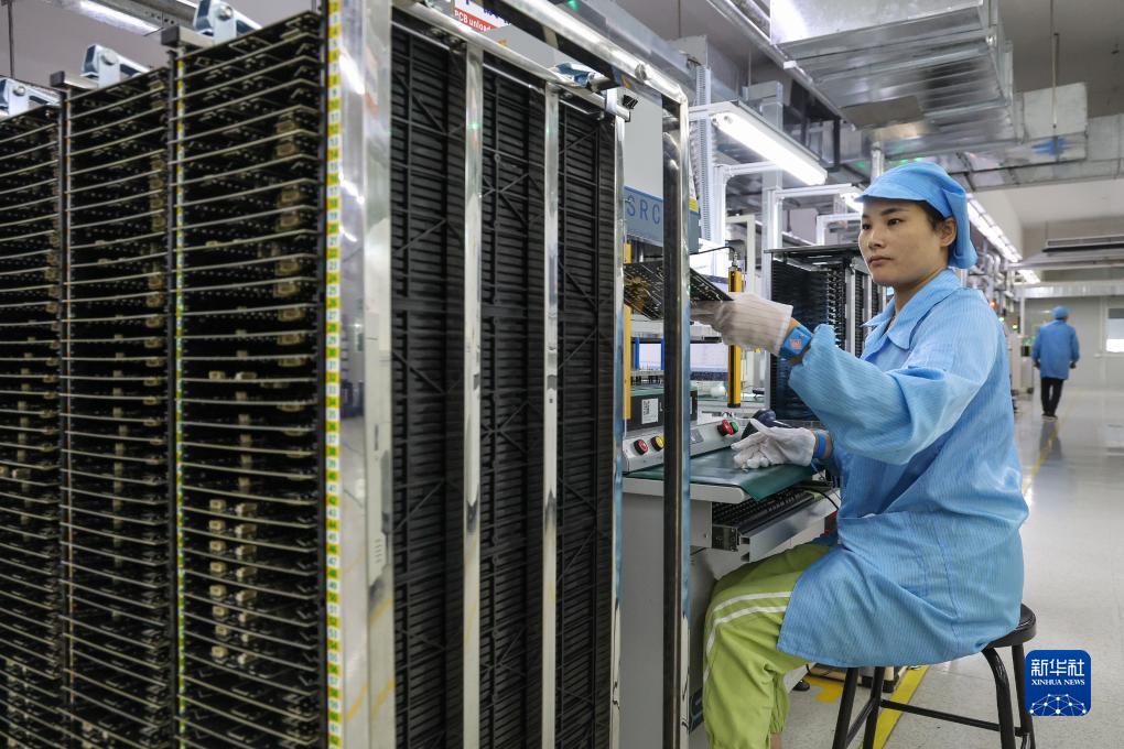 質檢員在佛山照明高明生產基地的車燈生產車間檢測產品(8月9日攝)。