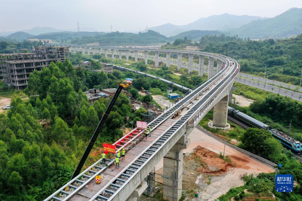8月10日,廣東清遠磁浮旅游專線最后一榀軌排被吊裝到橫跨京廣鐵路的長隆特大橋上(無人機照片)。