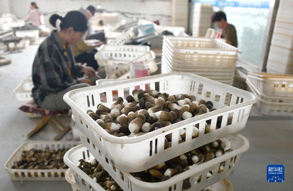 8月10日,在山東省菏澤市定陶區天中街道,人們在黑皮雞樅菌粗加工車間里工作。