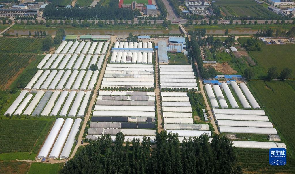 這是位于山東省菏澤市定陶區天中街道南城社區的一處種植黑皮雞樅菌的食用菌種植基地(8月10日攝,無人機照片)。