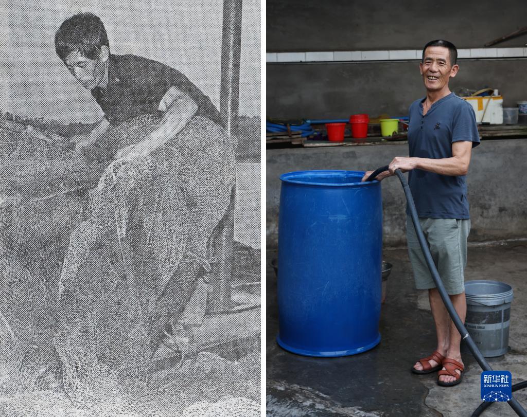 拼版照片:左圖為2008年,四川省宜賓市南溪區長江村漁民沈天正在長江上準備捕撈作業(翻拍資料照片);右圖為2023年6月29日,沈天正在自己開的沈九魚莊里準備食材,這些食材來自附近的水庫魚(新華社記者 江宏景 攝)。