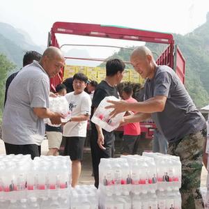 8月10日,在淶水縣龍門鄉,村民將捐贈的食品和飲用水卸車。