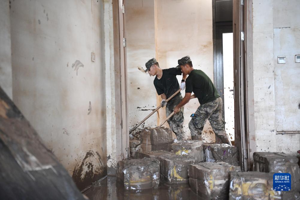 8月10日,武警河北總隊保定支隊戰士在涿州中學教學樓清理物品。