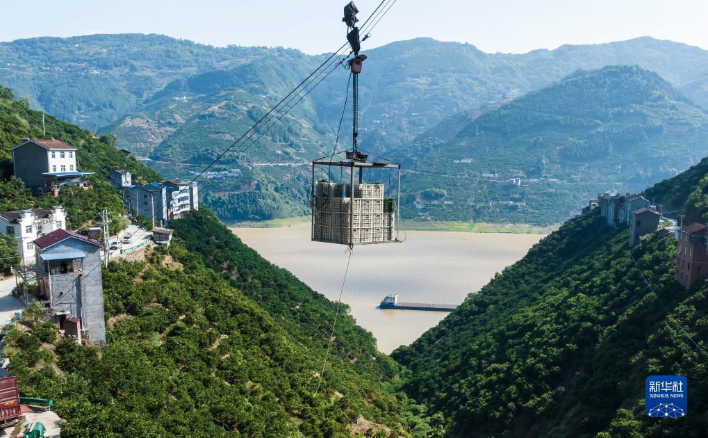 8月10日,秭歸縣泄灘鄉坊家山村村民用空中索道轉運柑橘(無人機照片)。