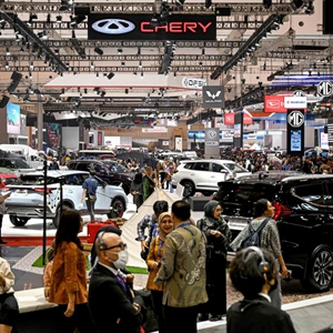 8月10日,在印度尼西亞萬丹省唐格朗的印尼會展中心,人們在2023年印尼國際汽車展上參觀。