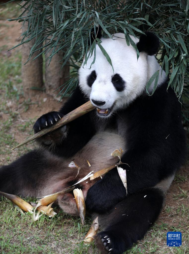 8月11日,大熊貓“剛剛”在鞍山動物園熊貓館室外吃鮮竹筍。