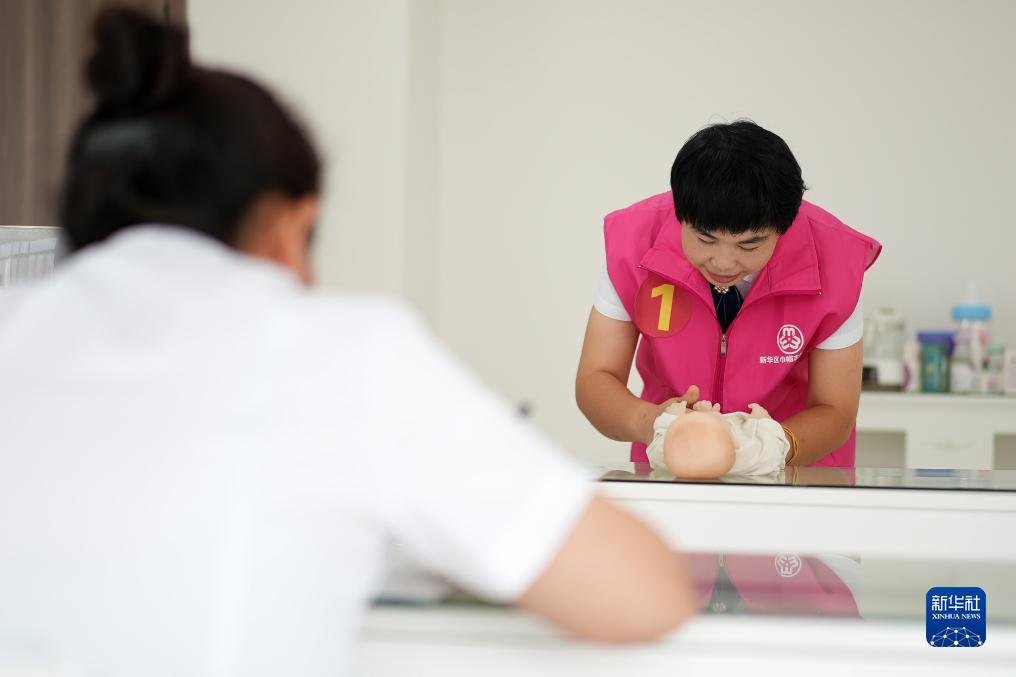 8月11日,在河北省滄州市新華區巾幗家政服務技能大賽比賽現場,參賽人員展示育嬰技能。