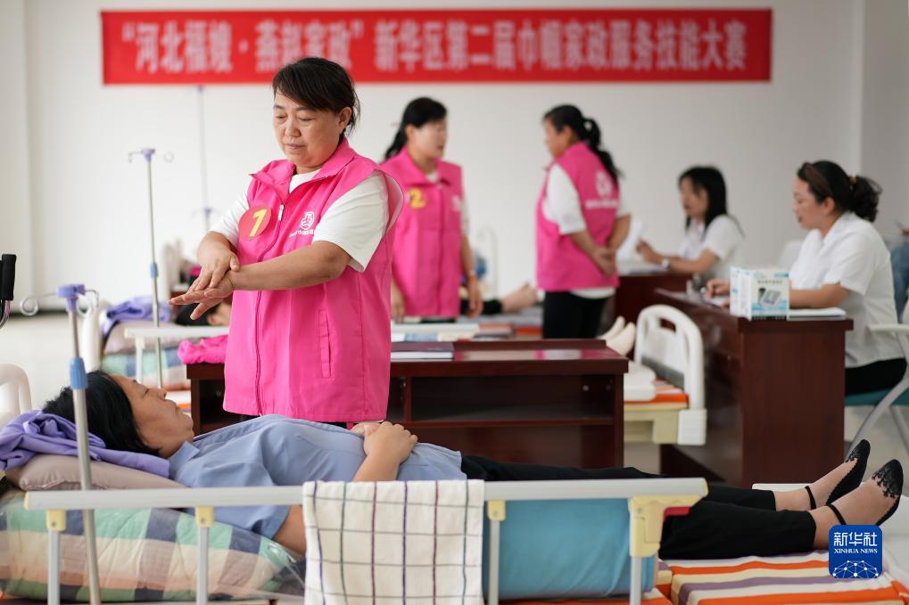 8月11日,在河北省滄州市新華區巾幗家政服務技能大賽比賽現場,參賽人員展示養老護理技能。