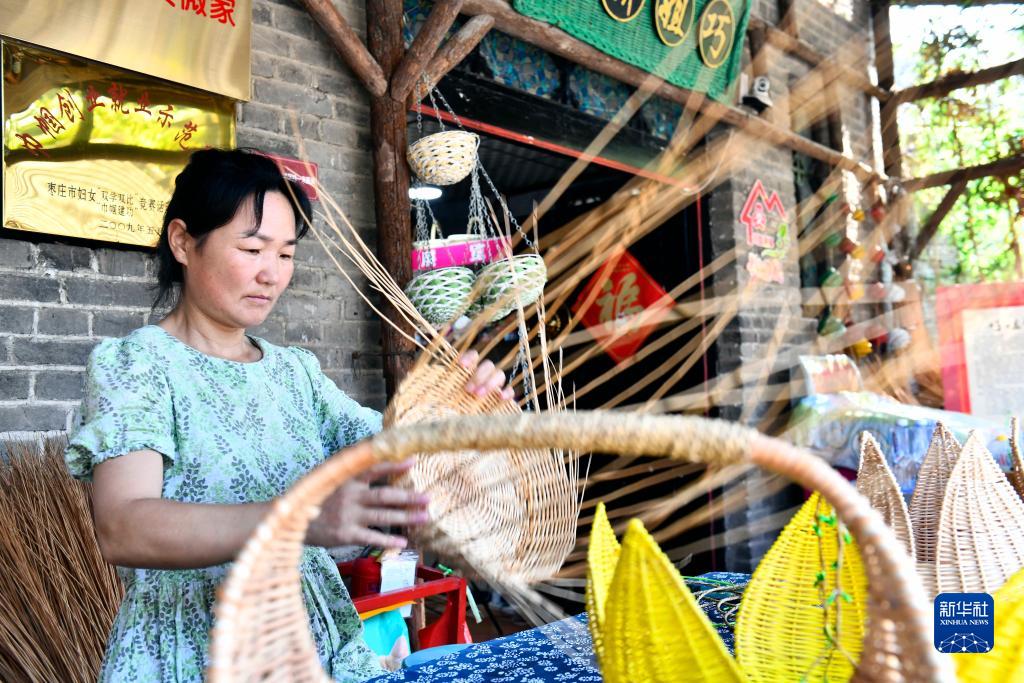 8月10日,在棗莊市薛城區柳編非遺工坊,非遺傳承人趙秀梅在制作柳編。