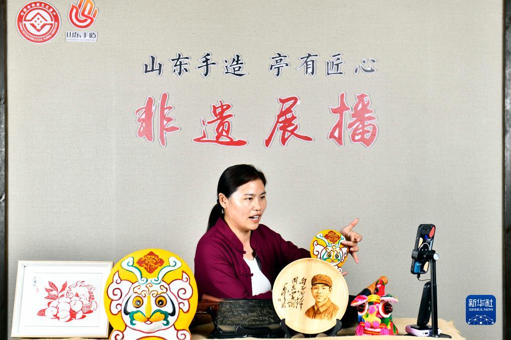 8月10日,在棗莊市山亭區非遺展示中心,工作人員在直播推介非遺作品。