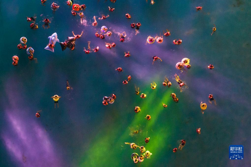 游客在西安市浐灞生態區一家水上樂園內游玩(8月10日攝,無人機照片)。