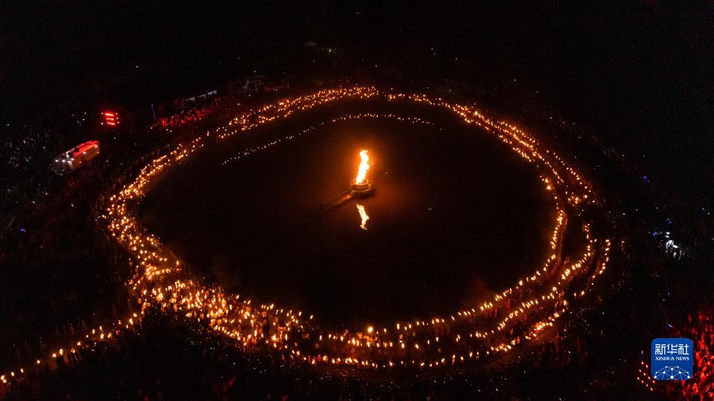 這是威寧彝族回族苗族自治縣板底鄉的篝火晚會現場(8月10日攝,無人機照片)。