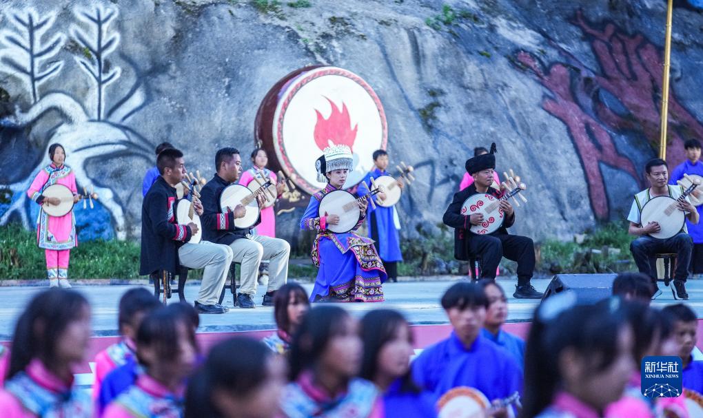 演員在威寧彝族回族苗族自治縣火把節活動上演奏月琴(8月10日攝)。