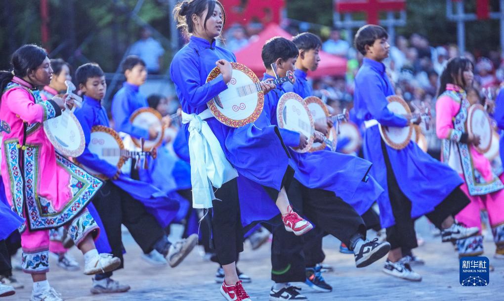 小朋友在威寧彝族回族苗族自治縣火把節活動上表演月琴舞(8月10日攝)。